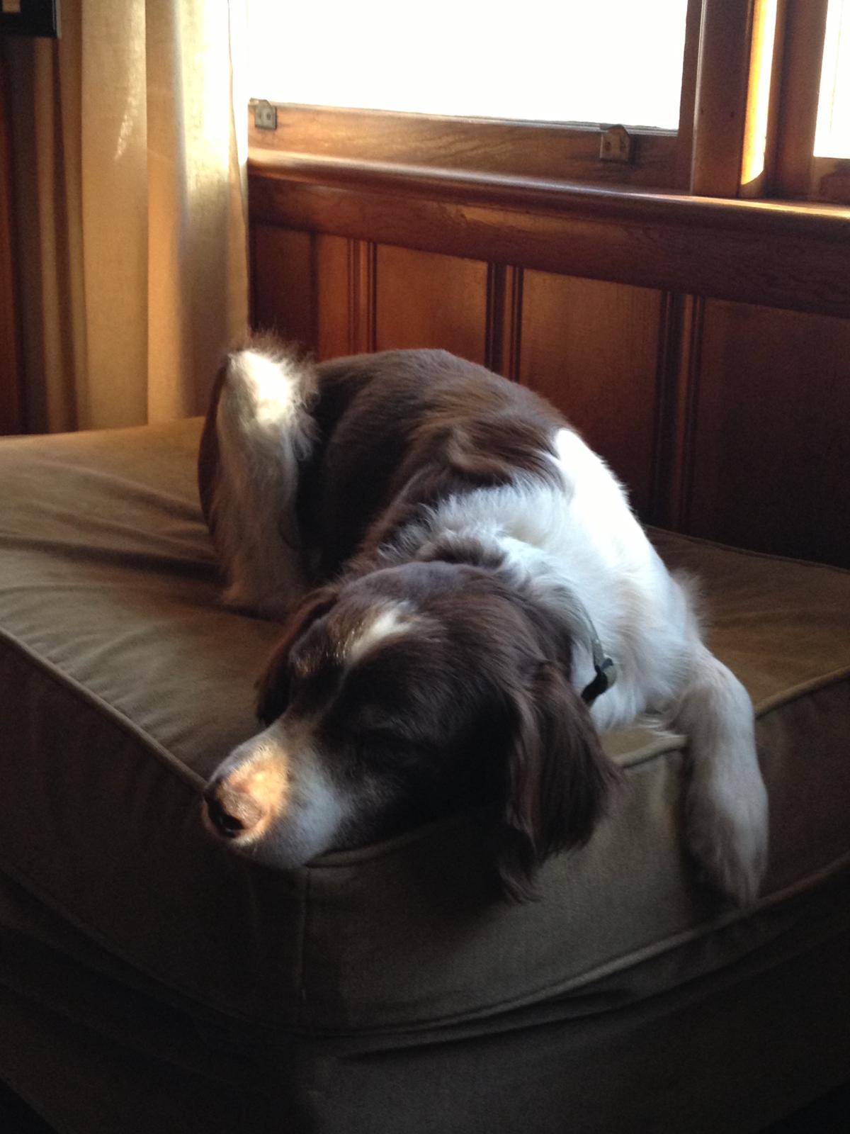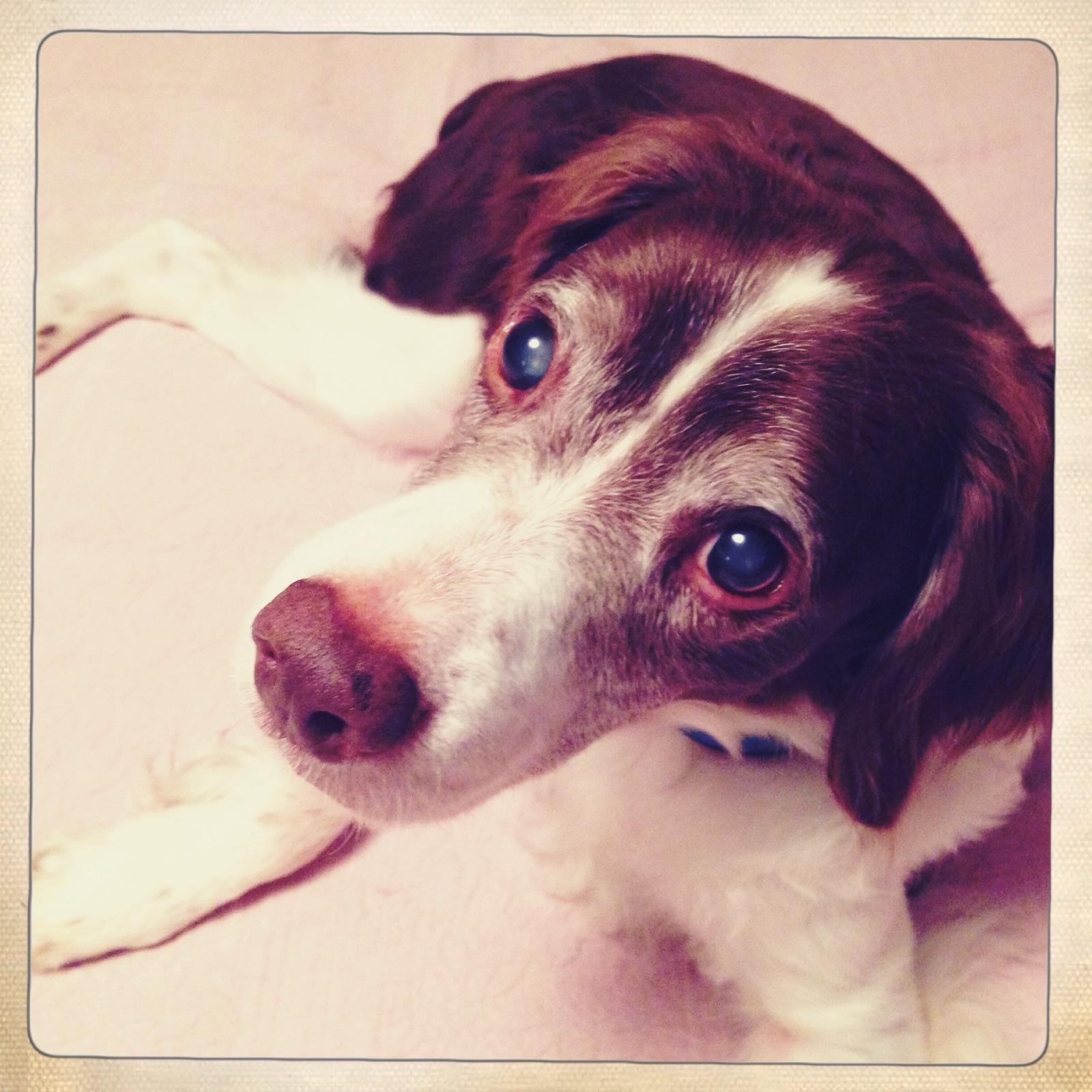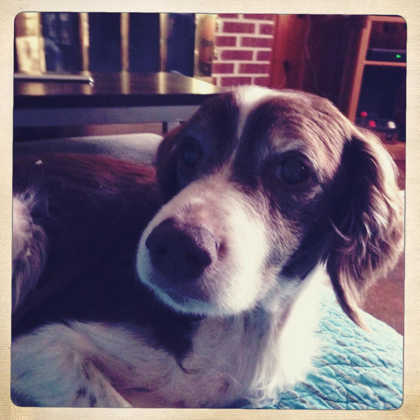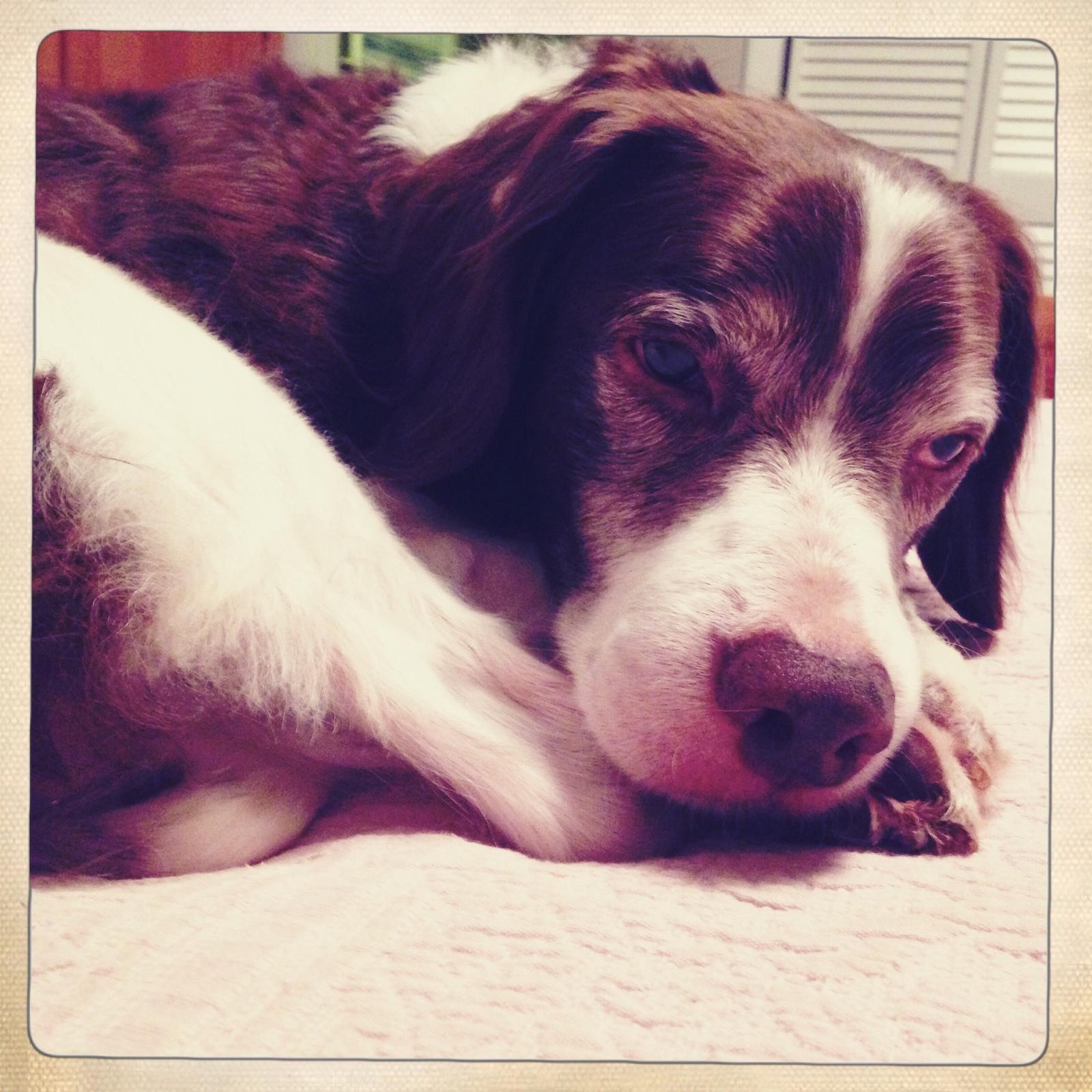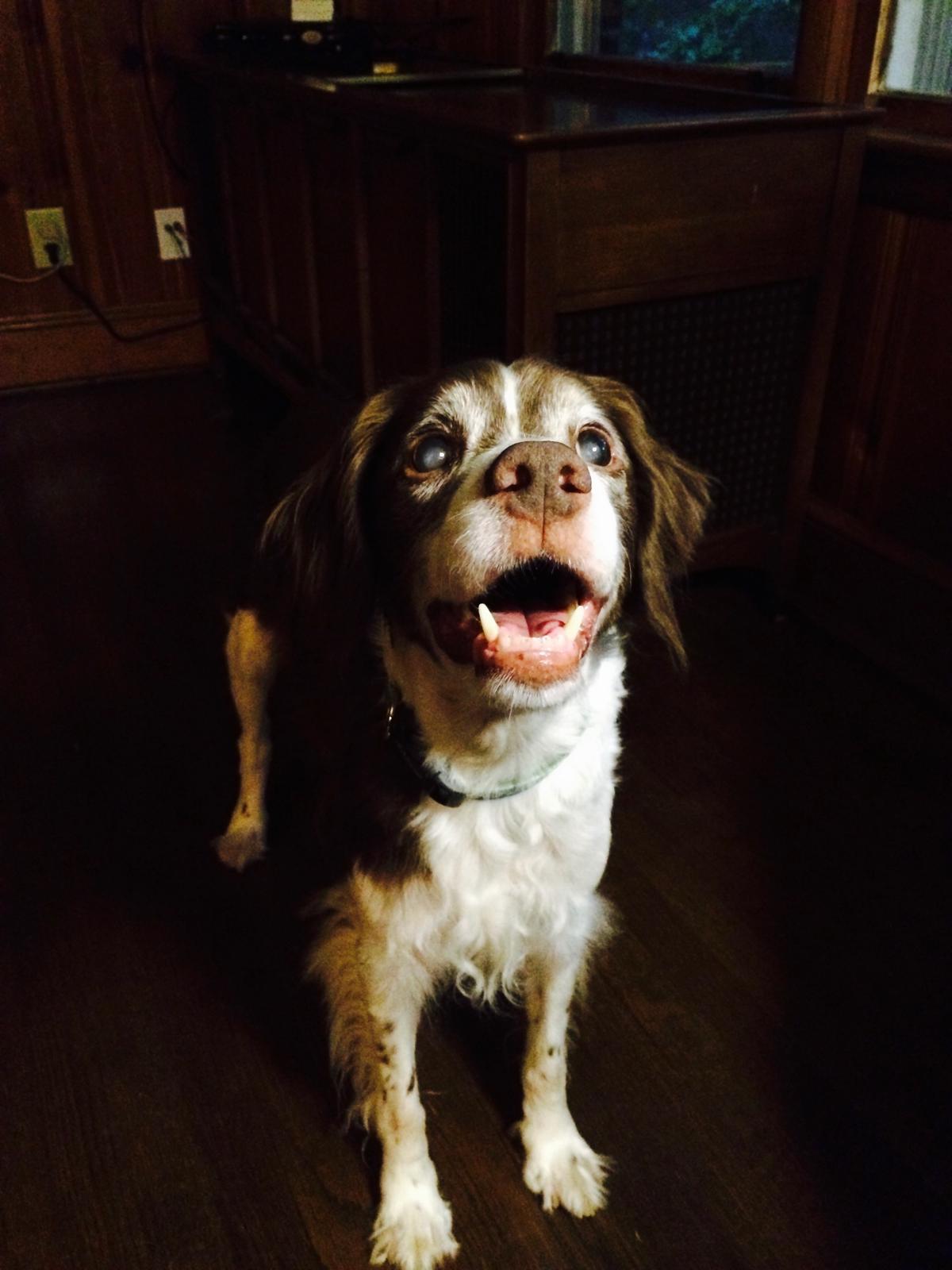 Alton was our second, named for the famous, local Food Network star Alton Brown, for his large amount of brown on his back. Alton was the pentultimate puppy buddy, he never let anything get him down. At around age 7, he developed an autoimmune condition known as SARDS, in which the body’s own immune system attacks and destroys the retinas leading to permanent blindness. Throughout that transition and for the rest of his life, Alton was both an inspiration to us all about turning life’s lemons into lemonade and a real trooper. A mentor to our foster Jessie, Alton would reliably, at 6 o’clock every day, hop down from our bed, go collect Jessie (also blind) and lead her to dinner.