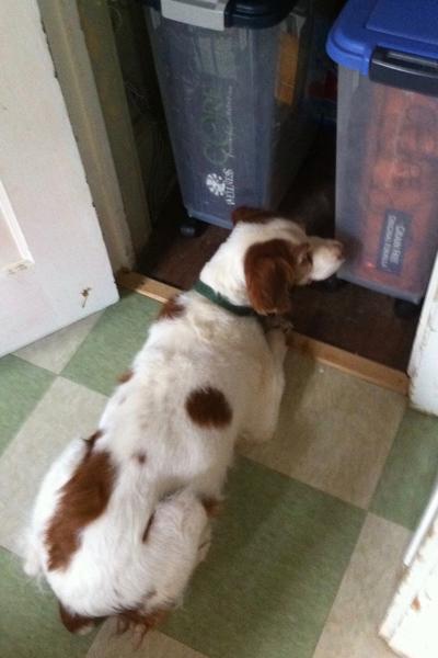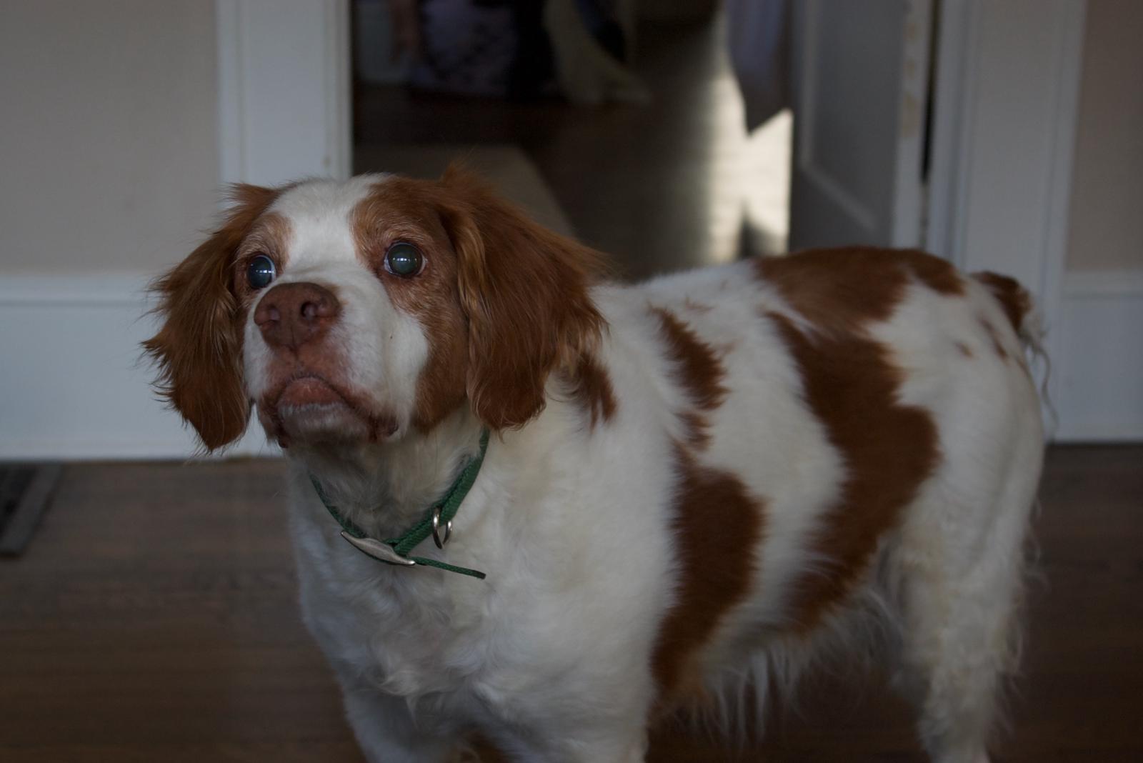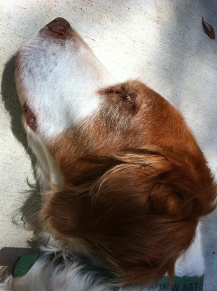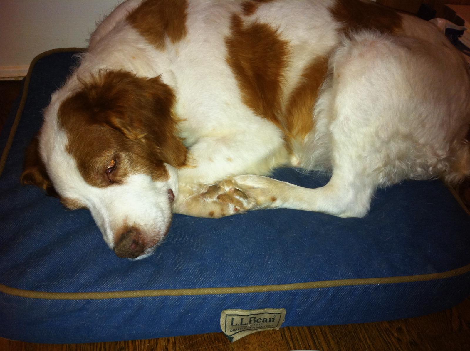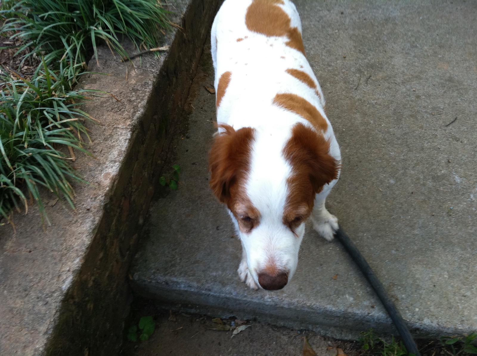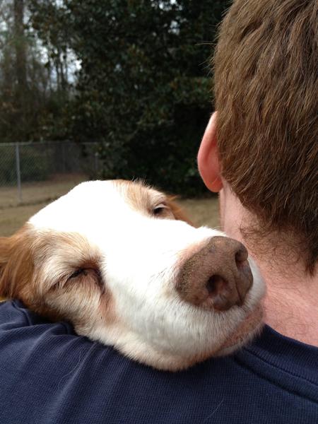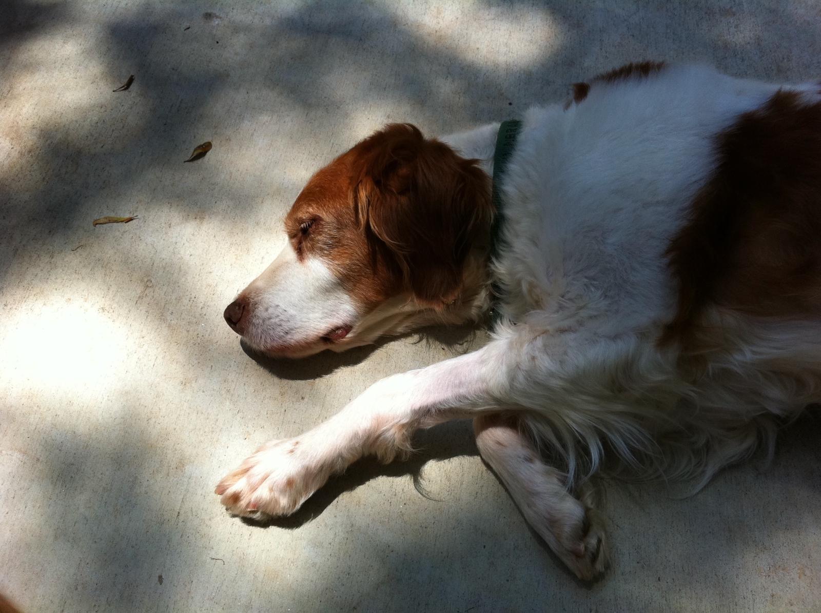 Jessie came to us from a farm in the central United States. She, like Alton, had grown blind and her owners did not know what to do with a hunting dog that could not see. They left her in her pen, where she chewed down her teeth trying to get out. They fed her, but she had so little exercise, that she gained weight and was barely ambulatory when she arrived in Atlanta via the shuttle. Over the next several years, Collin worked with her to rebuild her strength, reduce her excess weight. Alton, our blind dog, also made an effort to help her navigate the house. She never lost her desire for food, as many of these pictures show. She was a special senior dog addition to our family; something we very much recommend.