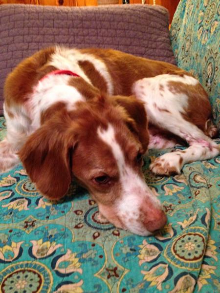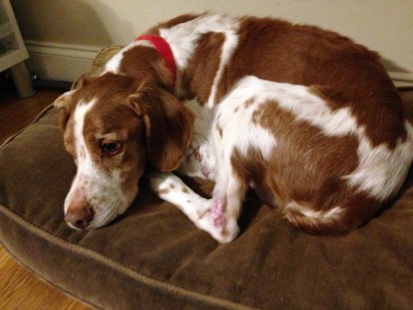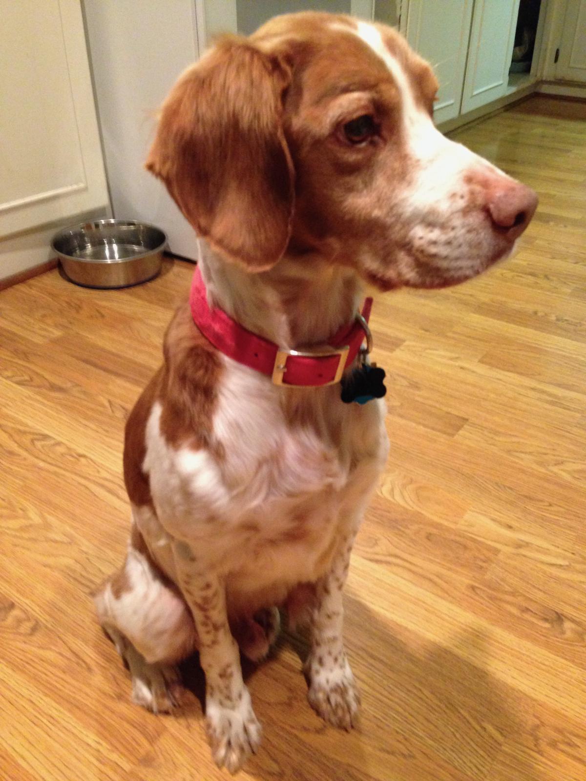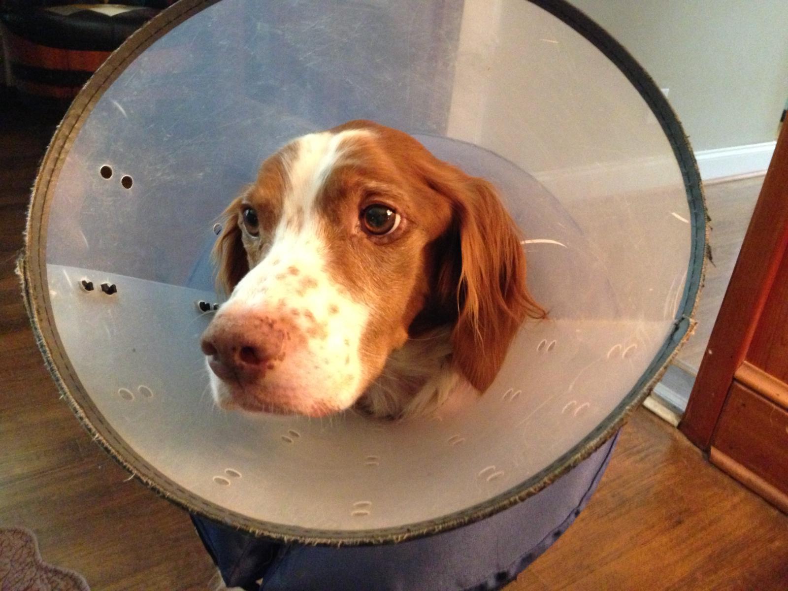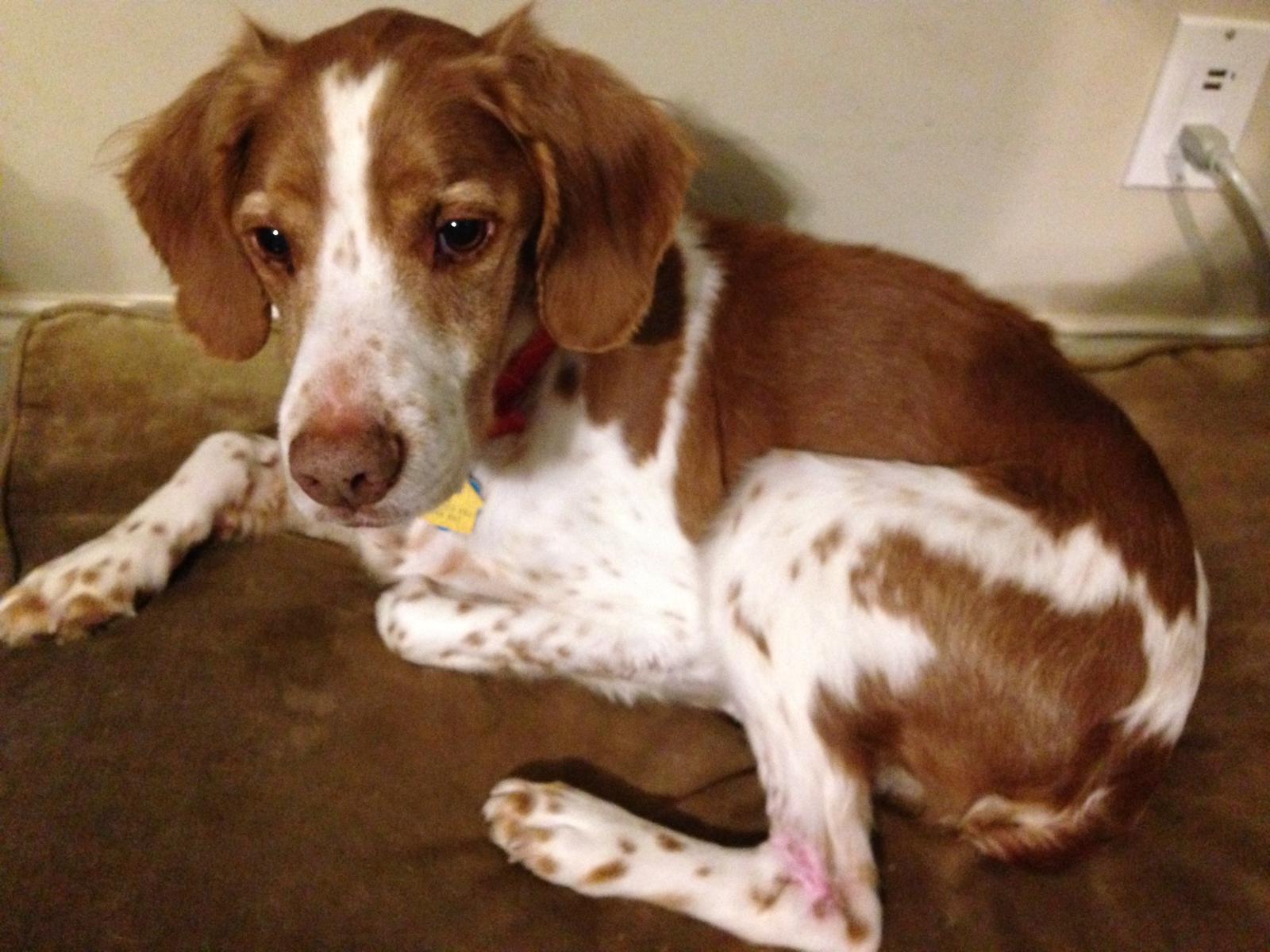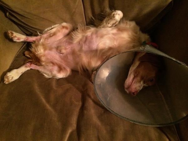 Riley (aka “Riley Cone”) was a temporary placement from NBRAN. Originally suspected of suffering intense flea strike on his buttocks, legs, and back, doctors at UGA Veterinary Clinic identified a food allergy. For the first half of his stay with us, Riley had to wear a cone of shame; he did not like it, though he did come to tolerate it by the time he was able to remove it for good. Once he was placed on a hypoallergenic kangaroo-based food, his lesions and sores cleared up and he was cone free. He was subsequently placed in a forever home.